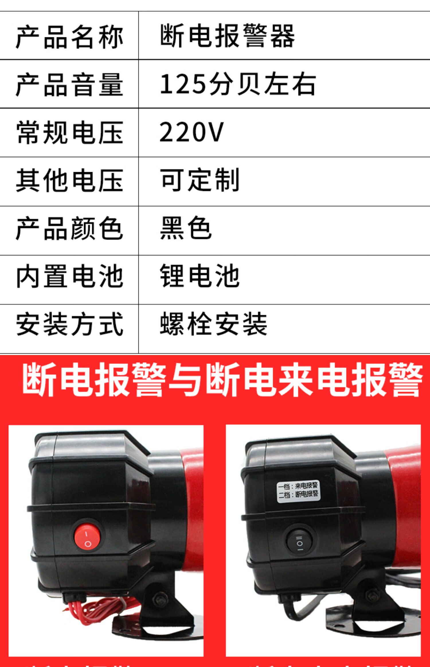 斷電/聲光報警/220v線頭款 斷電/聲光報警/220v插頭款 來電/斷電一體/聲光報警220v-線頭款 來電/斷電一體/紅喇叭220v-線頭款 斷電報警/紅喇叭/220v-插頭款 斷電報警/紅喇叭/220v-線頭款 斷電報警/紅喇叭/380v三線 斷電來電一體/紅喇叭/380v三線 斷電報警/紅喇叭380v四線 斷電來電一體/紅喇叭/380v四線 斷電報警/黑喇叭220v-線頭款 斷電報警/黑喇叭220v-插頭款 來電/斷電一體/黑喇叭220v-線頭款 斷電報警/黑喇叭380v三線 斷電來電一體/黑喇叭/380v三線 斷電報警/黑喇叭380v四線 斷電來電一體/黑喇叭/380v四線